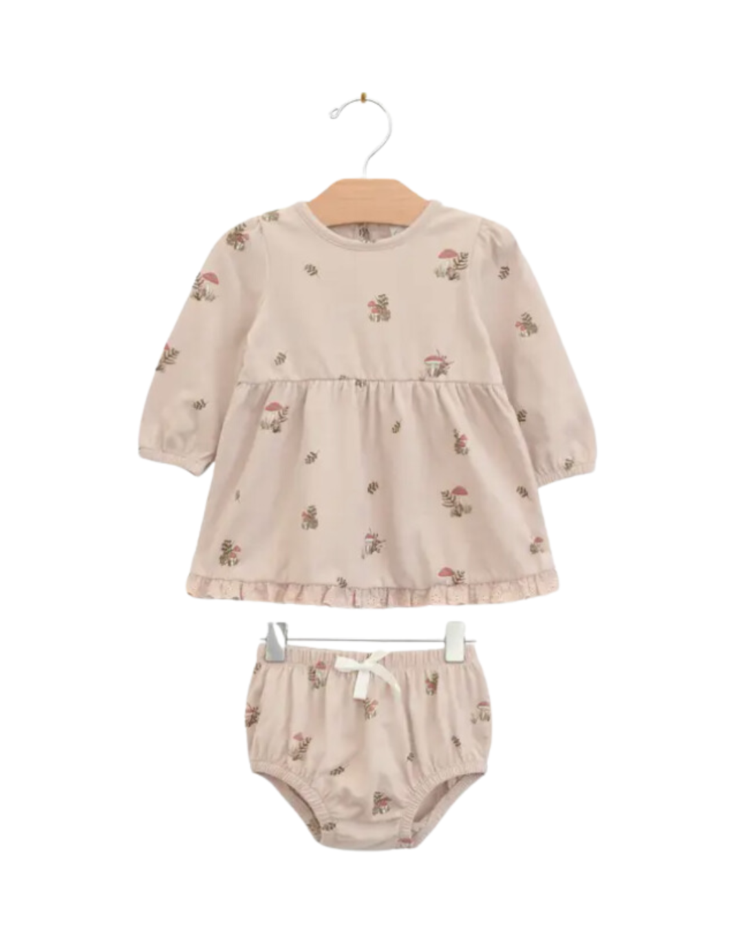 Meet your new favourite two-piece - The Willa Set is pure sweetness from head to toe. The whimsical mushroom-print dress delights with delicate lace trim along the skirt, perfectly paired with matching bloomers for an effortlessly adorable look.