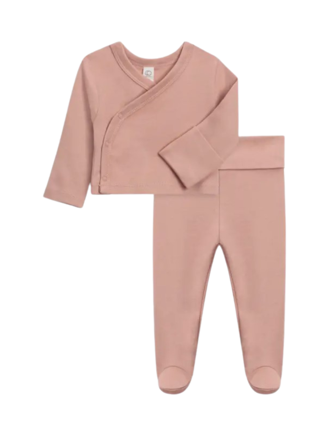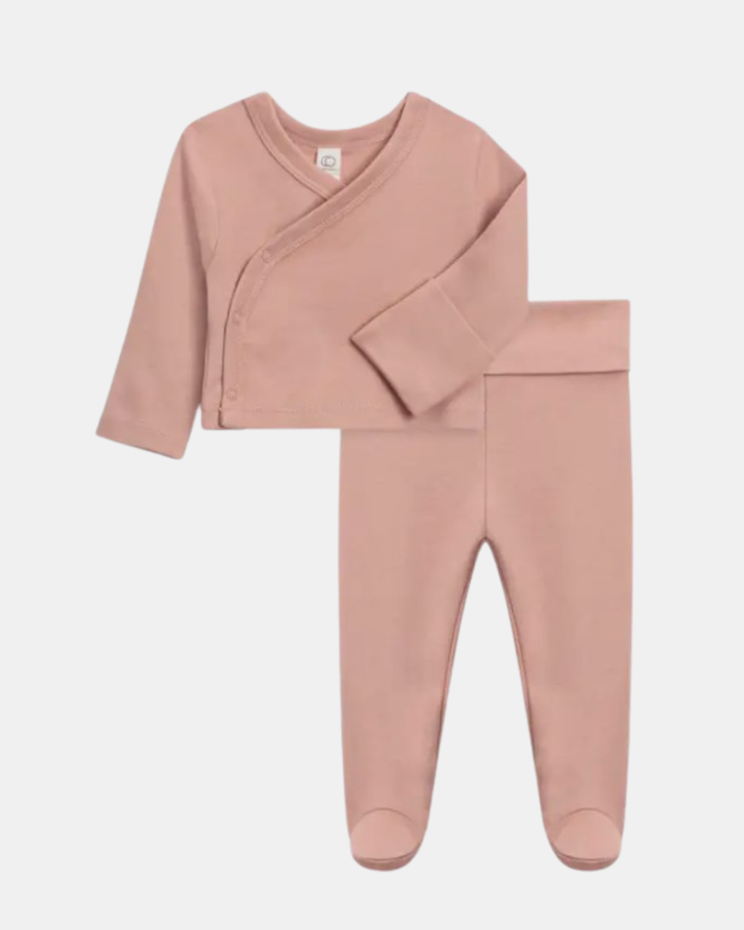 This sweet two piece in delicate blush pink is just the thing to keep your newborn all wrapped up in style.